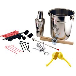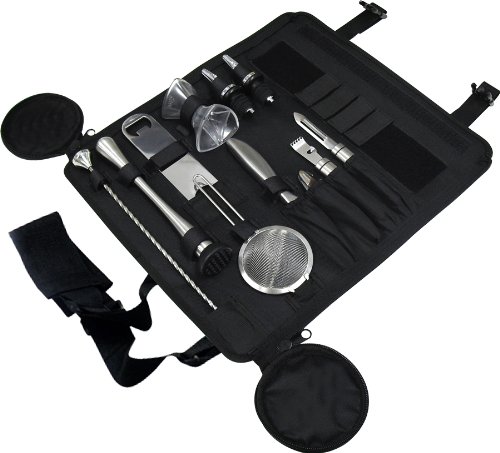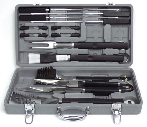 The tools are all approximately 19 inches in length. Most versatile is the 4-in-1 spatula, which not only lifts and drains meats, but also cuts with a sharp serrated edge on one side, tenderizes meat with prongs on the other, and opens bottles with its looped end. Heavy-duty, toothed tongs taper to pick up small pieces of food, but require a strong grip to hold together. A double-pronged fork spears everything from a whole chicken to thin hot dogs, while the knife with extra-long 9-inch blade cuts through thick steaks with ease. The brush features a 1-1/2-inch wide basting surface. All the tools have stainless-steel hanging loops except the tongs, which have a leather cord. For best results, wash and dry the tools by hand. Mr. Bar-B-Q covers the set with a lifetime warranty. --Ann Bieri